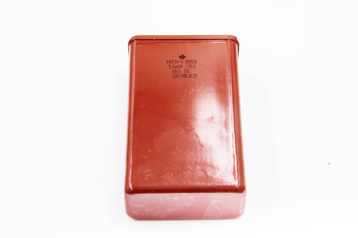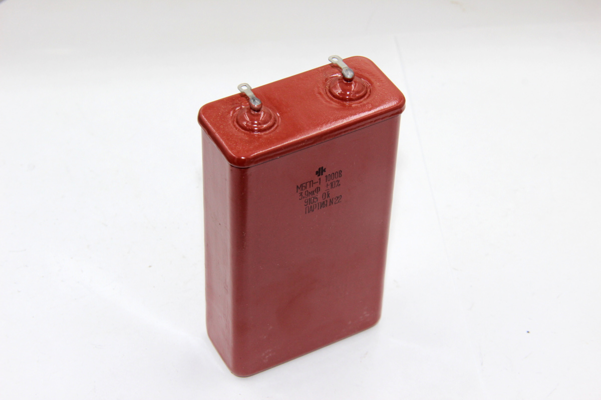 МБГП-1 1000В 3.9 мкф конденсатор металлобумажный герметизированный высоковольтный импульсный пуско-рабочий конденсатор постоянной ёмкости, предназначены для эксплуатации в цепях постоянного, переменного или пульсирующего тока.Конденсатор относится к разделу пассивных электронных компонентов. По конструкции состоит из двух электродов в форме пластин (называемых обкладками), разделённых диэлектриком, толщина которого мала по сравнению с размерами обкладок.