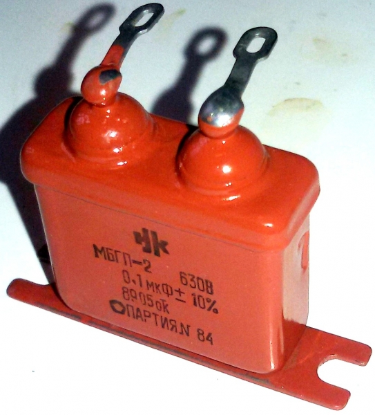 МБГП-2 630В 0,1мкФ конденсатор металлобумажный герметизированный высоковольтный импульсный пуско-рабочий конденсатор постоянной ёмкости, предназначены для эксплуатации в цепях постоянного, переменного или пульсирующего тока.Конденсатор относится к разделу пассивных электронных компонентов. По конструкции состоит из двух электродов в форме пластин (называемых обкладками), разделённых диэлектриком, толщина которого мала по сравнению с размерами обкладок.