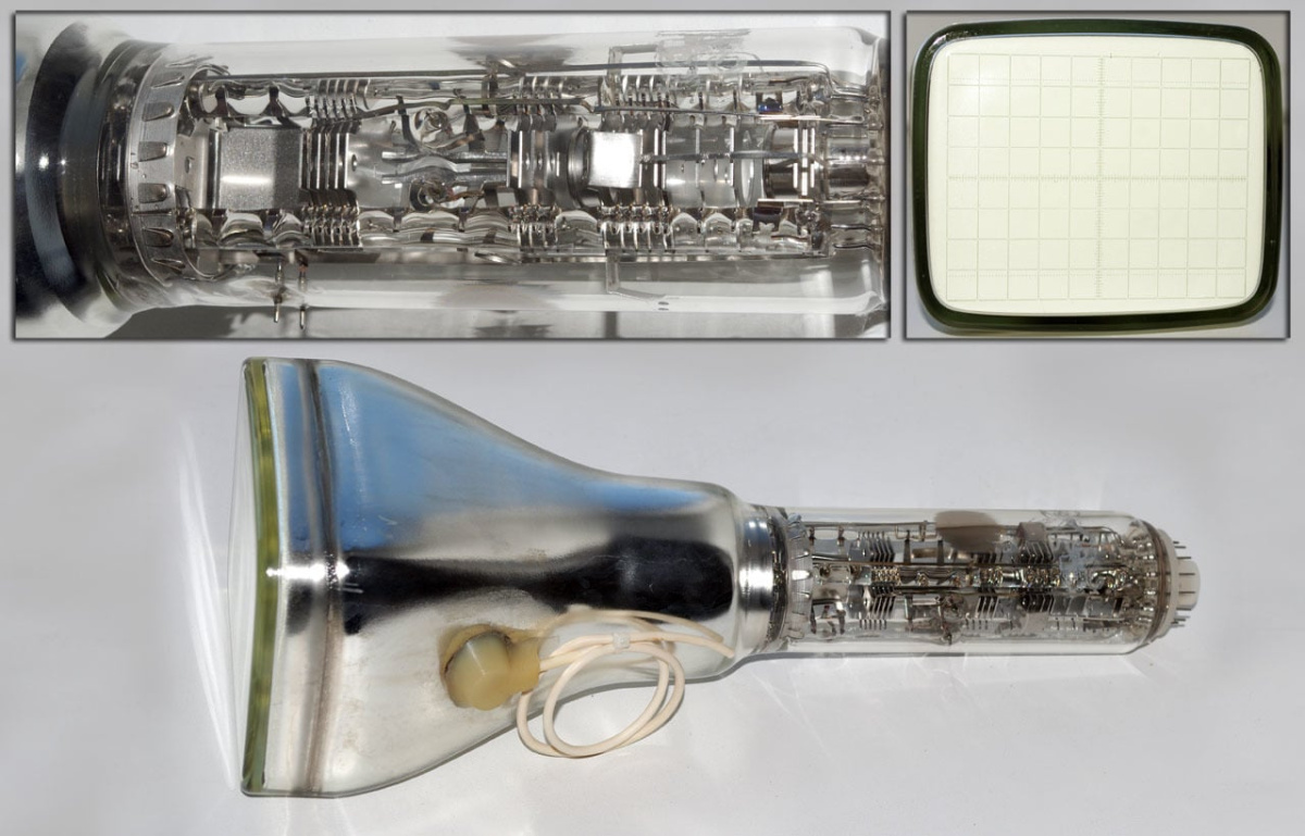 Однолучевая трубка, с промежуточным электродом, экранирующими пластинами, сеткой и анодом коррекции астигматизма, с одной ступенью послеускорения, с экраном прямоугольной формы и шкалой беспараллаксного отсчета.