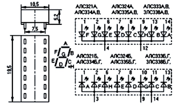 У индикатора АЛС321А1 элементы имеют общий катод, у АЛС321Б1 — общий анод. Высота знака 7,5 мм.