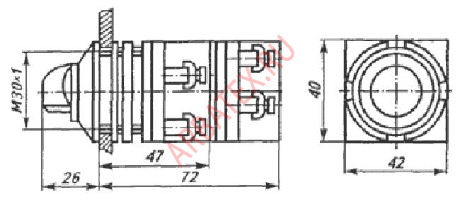 Переключатель ПЕ 191Х, кроме этого, еще имеет оболочку со стороны контактного блока и втулки со стороны привода, обеспечивающие защиту контактного блока от химически агрессивной пыли и влаги.
