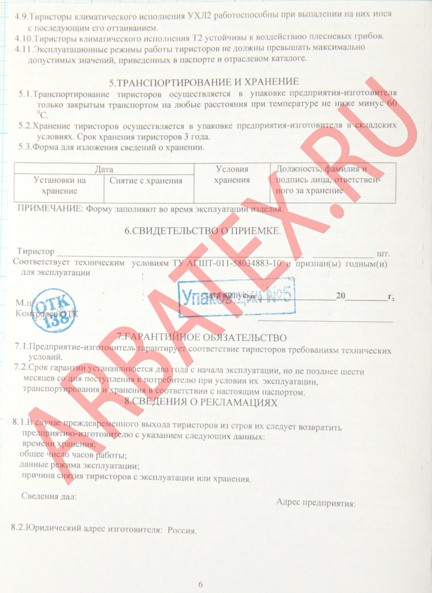 Тиристоры могут изготавливаться для эксплуатации в умеренном, холодном и тропическом климате.