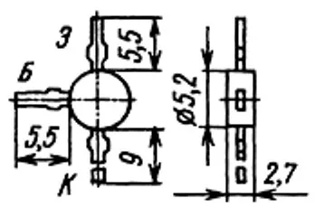 На крышке корпуса транзистора наносится условная маркировка цветным кодом: две синие точки.