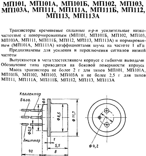 МП113 транзисторы кремниевые сплавные n-p-n усилительные низкочастотные с ненормированными и нормированными коэффициентами шума на частоте 1 кГц.